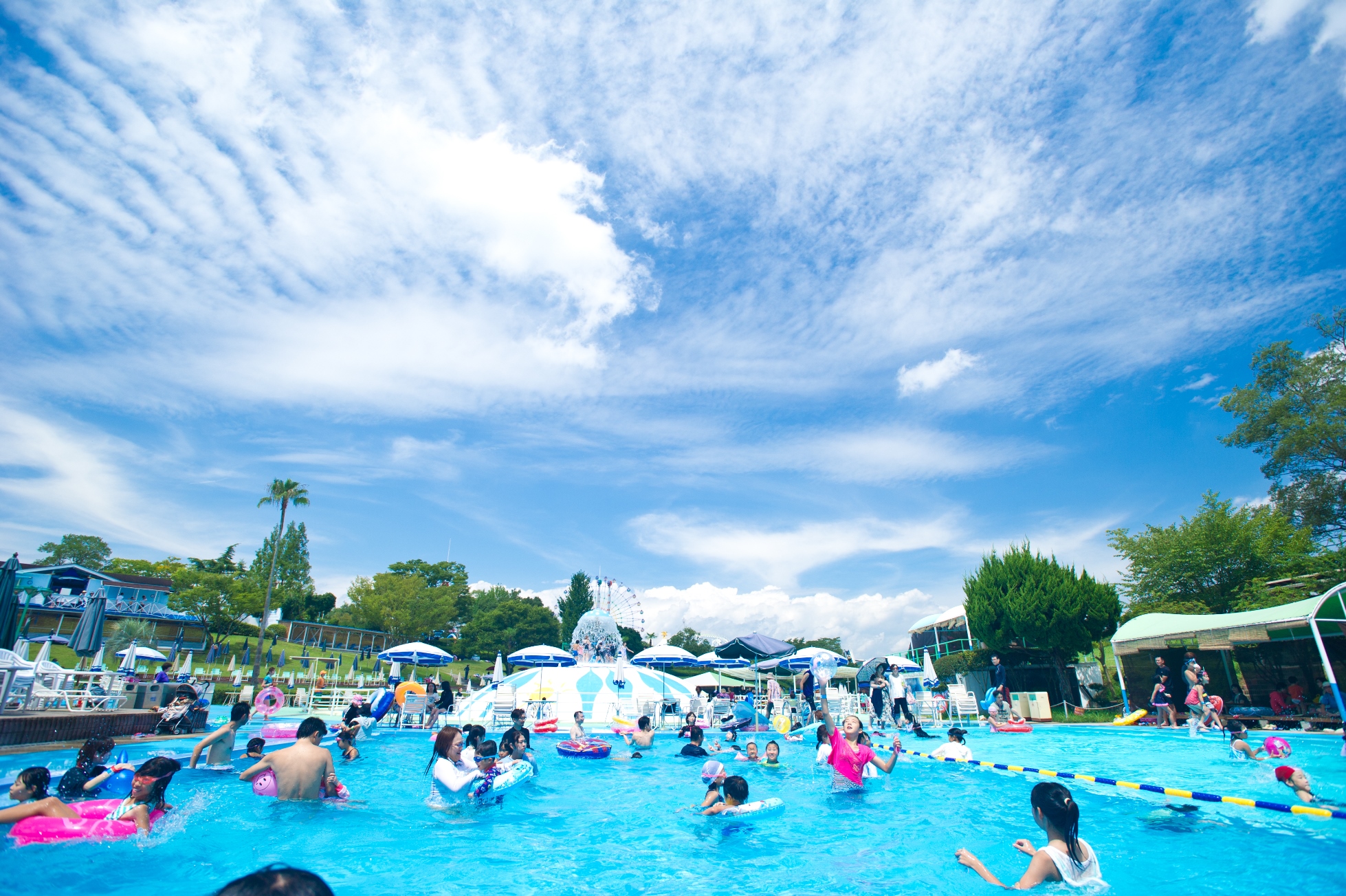 みろくの里のレジャープールは、5つの個性あるエリアから構成され、西日本ではみろくの里にしかない直径20メートルの巨大なトランポリンドームをはじめ、楽しみ方が異なる3つのウォータースライダーも爽快です。また、子ども専用のスライダーや水深の浅いプールを備えたキディープールなど小さなお子さまもお楽しみいただけます。