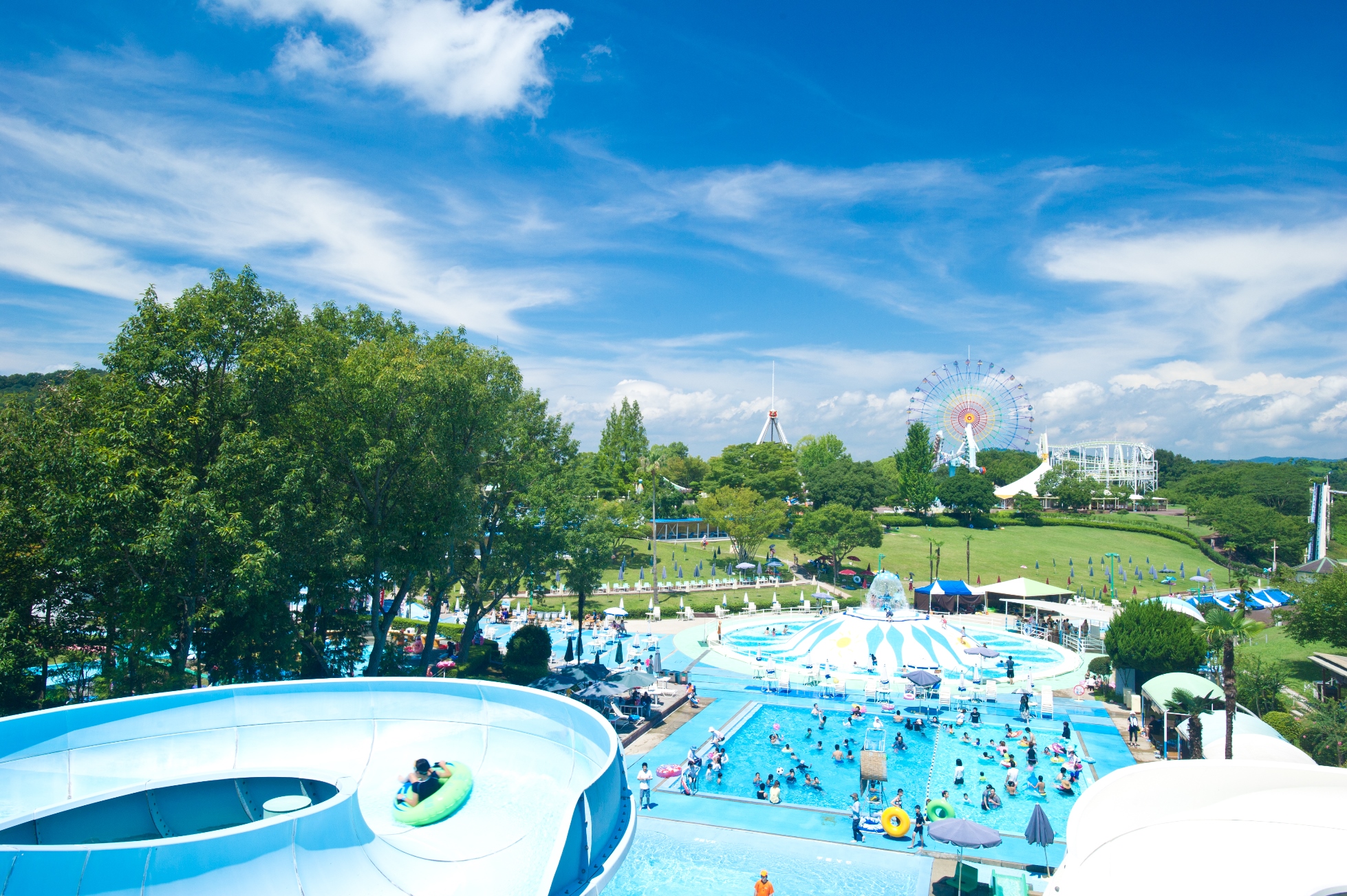 みろくの里・夏のレジャープール本日(7/15)オープン!西日本唯一のシャワードームと3種のスライダーと遊び方は自由!