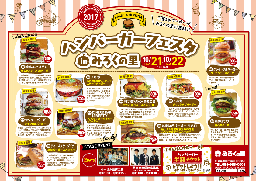今年で3回目の開催となる「ハンバーガーフェスタ2017 in みろくの里」では、新規出店3店舗を含む合計10店舗が出店します。行列必至の大人「九条ねぎバーガー マハロ(京都)」は3年連続の出店になり、地元からは神石高原バーガーの「車のタンチ」が出店します。ステージイベントには、日本各地でのライブイベントや美術館・ホテルでのコンサートなどで活躍する“イーゼル芸術工房”に、昭和歌謡からアニソンまで多彩なレパートリーを歌うパフォーマンスユニット“私立應南学院高等部”のステージイベントを予定しています。