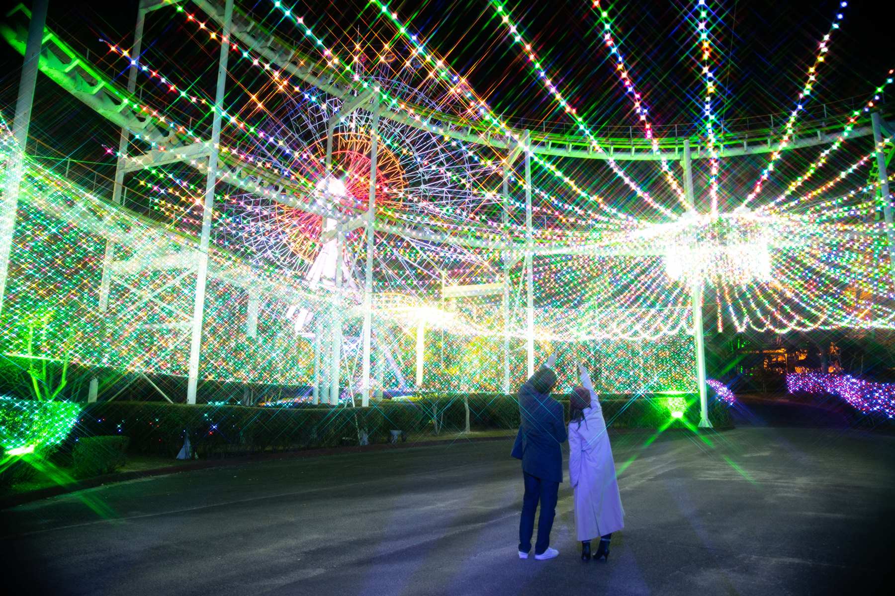 大観覧車や全長800メートルの本格ジェットコースター「ヒマラヤコースター」に通ずる宇宙エリアには、カラフルなライトアップが施されています。
